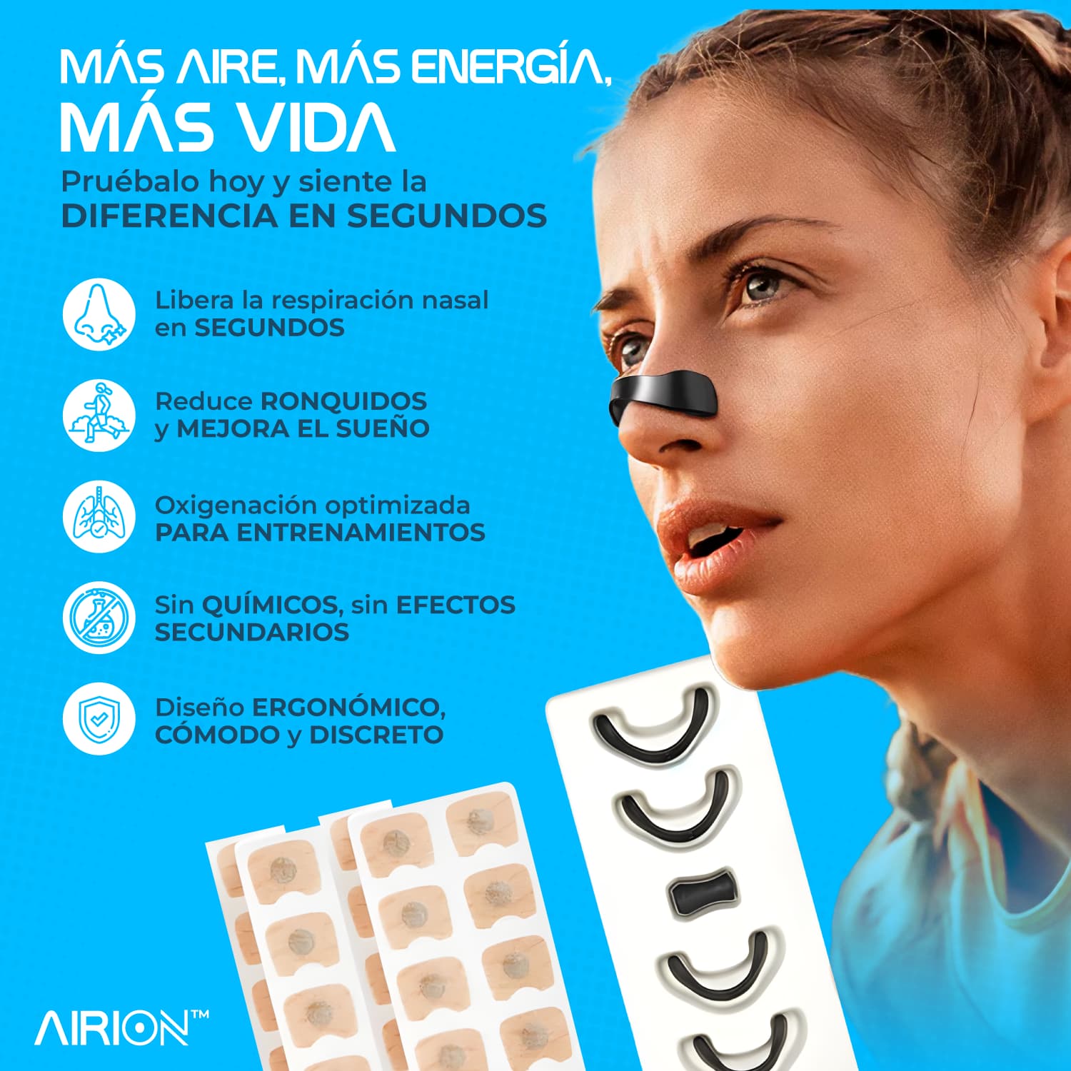 Sí. AIRION® utiliza un diseño ergonómico clínicamente probado que aumenta el flujo de aire nasal hasta un 40 %, mejorando la respiración desde el primer uso. Esto reduce los ronquidos, mejora el descanso y aporta más energía durante el día. No usa químicos ni medicamentos, solo tecnología nasal avanzada.